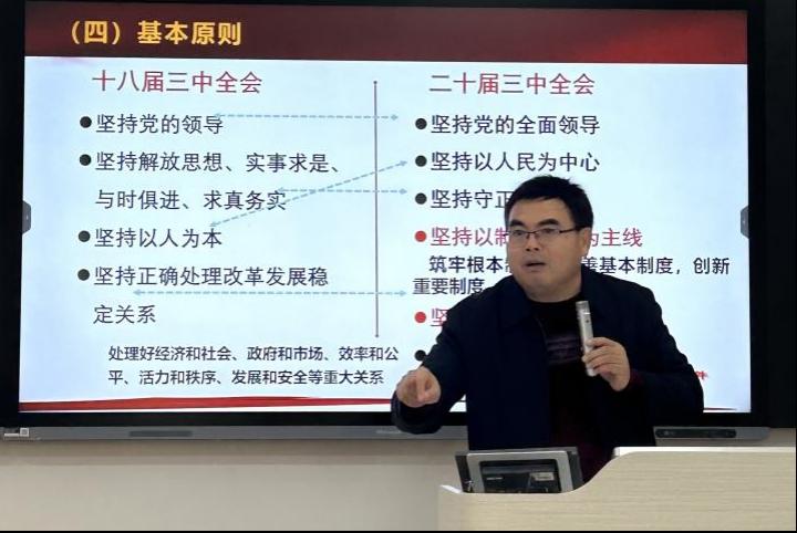 杨建中教授以《进一步全面深化改革的行动纲领》为题,从三个主要方面对党的二十届三中全会精神进行了全面而深刻的系统阐释。