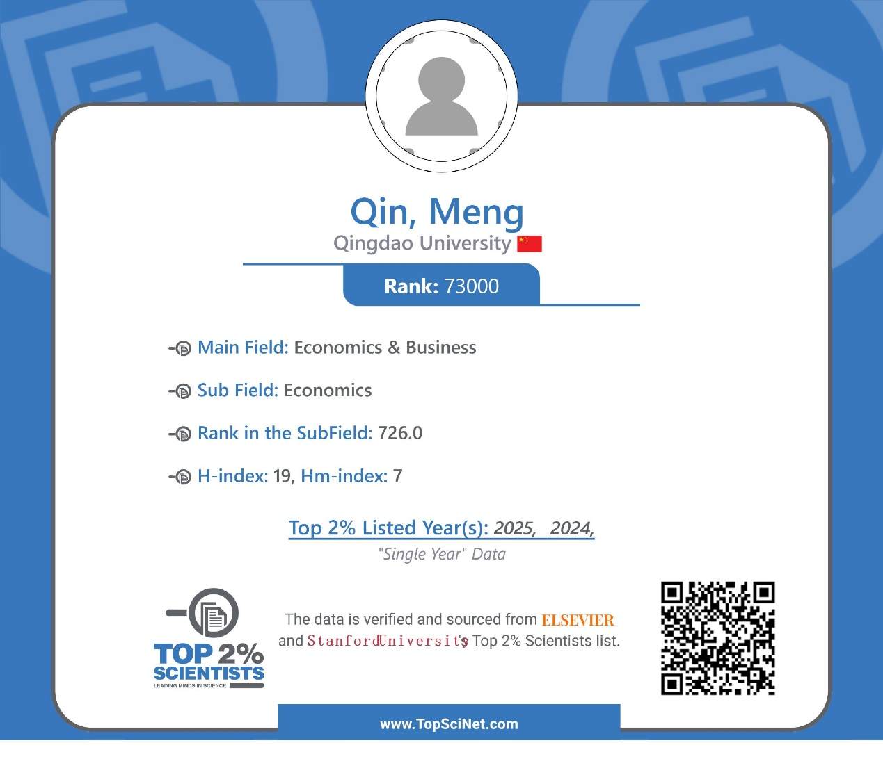 秦梦副教授再次入选榜单,位列全球经济学子学科排名726位(总31685人),与2024年排名1804位(总47525人)相比有大幅提升,实现学院在国际学术领域新突破。